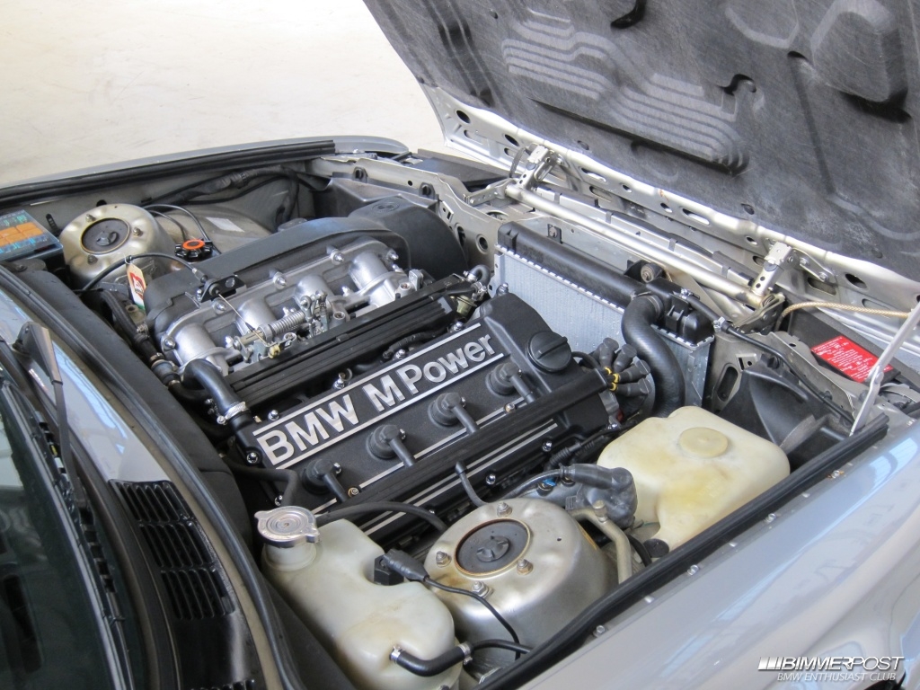 The engine puts out 192 hp (DIN) at 6,900 rpm and 155 lb/ft of torque at 4,900 rpm. This is down slightly compared to the non-catalyst, 2.3-liter S14 used in the E30 M3 which is rated at 200 hp (DIN) at 6,750 and 176 lb/ft of torque at 4,750 rpm.