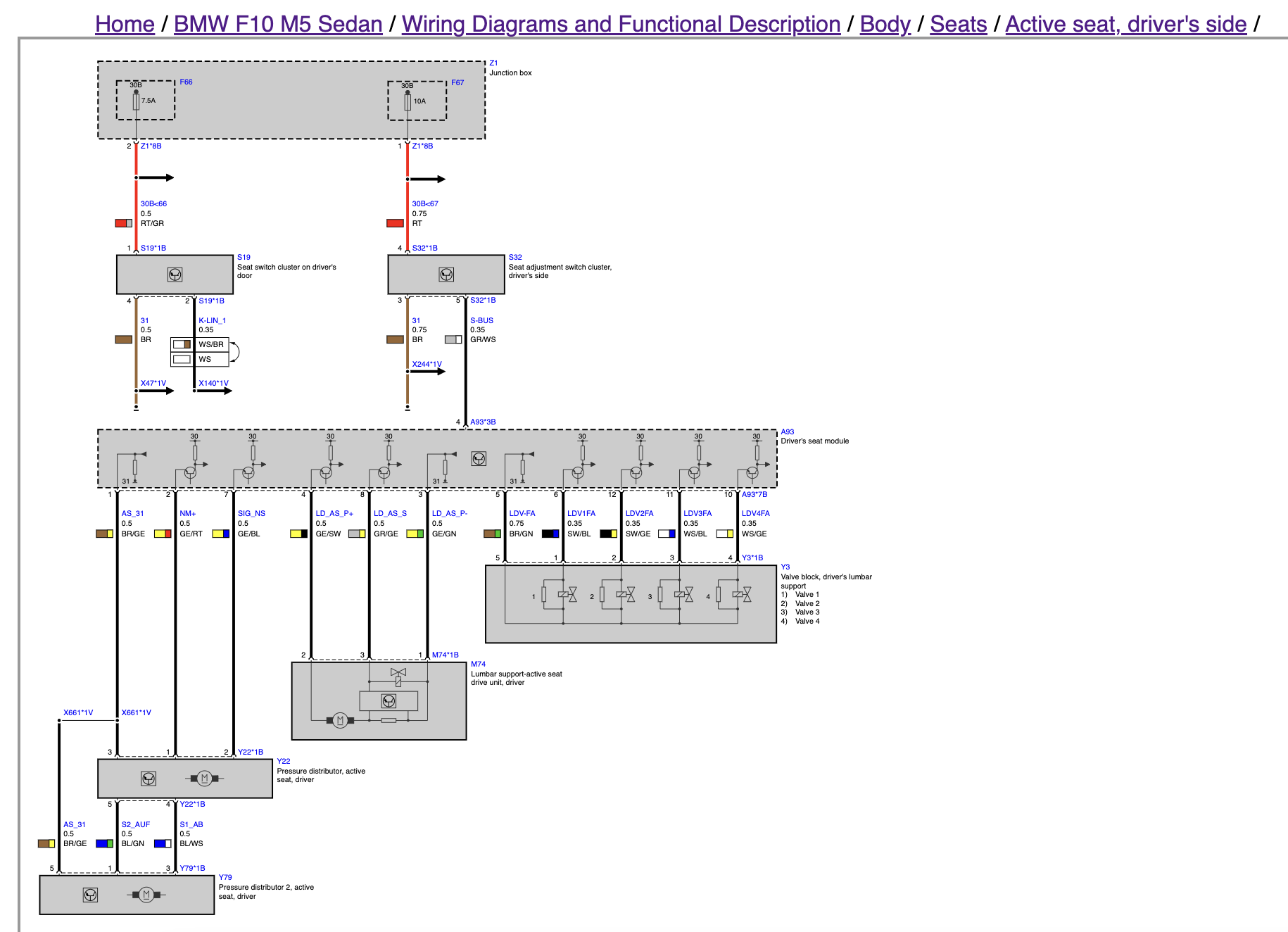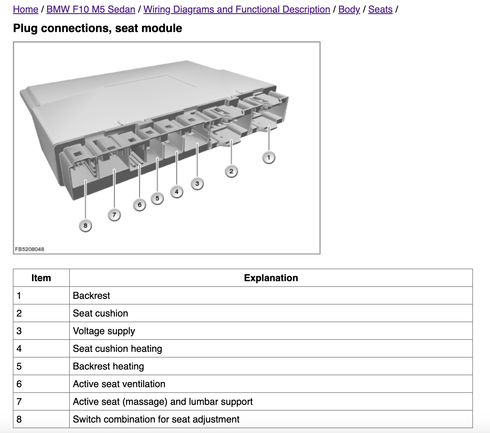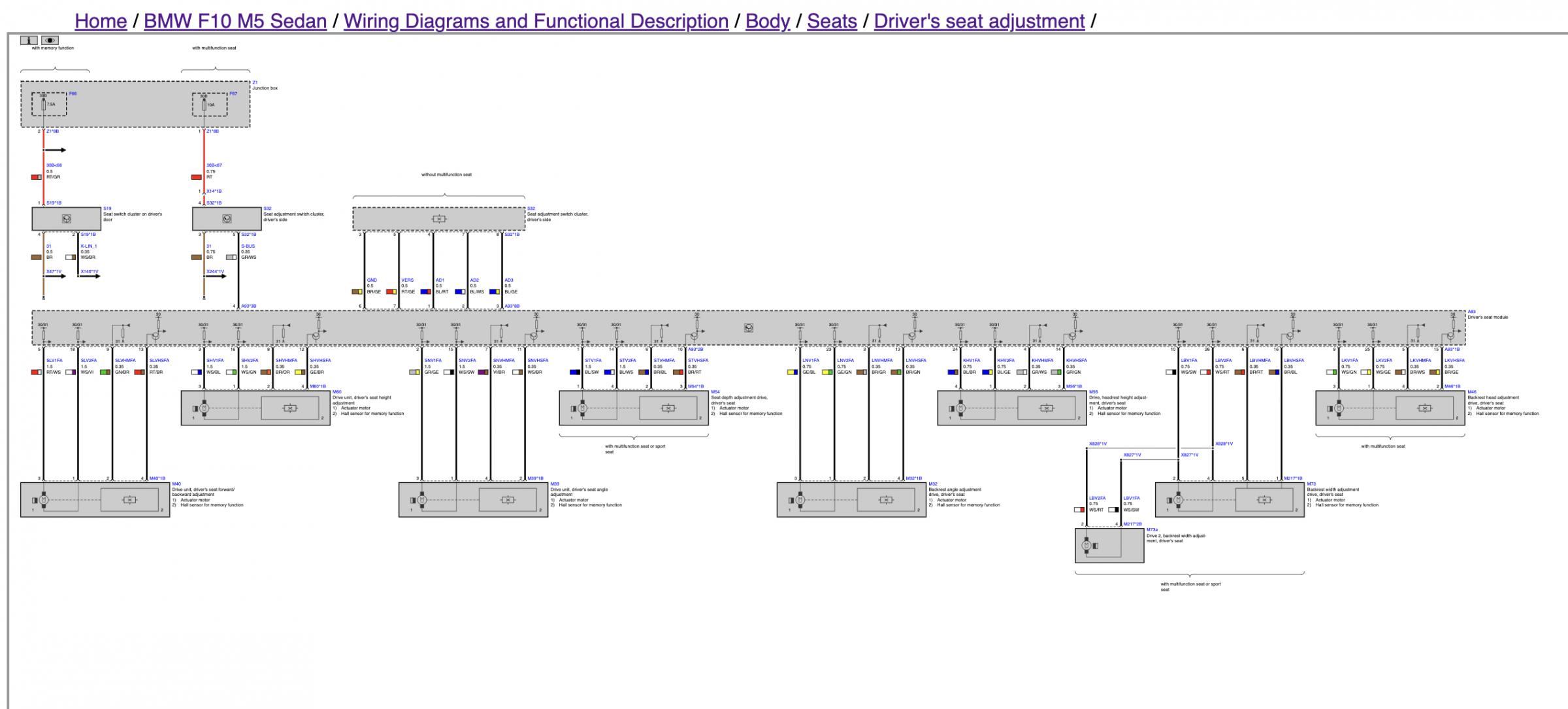 I need to look into the SRS and Seat Occupancy diagrams as well. Heating/vent fans, movement, lumbar and active seating appear to be covered in the screenshots in this thread. I believe the other functions are different systems beyond "seats". So back to the diagrams I go! Update on what I found: For E70, 14 wires total between two connectors. "Main connector" is comprised of three sub connectors, (black and two grey), encased in a Yellow connector. The second connector is yellow with just two wires. MAIN CONNECTOR: Black plug: Orange/Green - I believe KCAN feed Green - I believe KCAN feed Red/white - 7.5a 12v feed for seat adjustment switch Brown/Black - I think this is the wire to connect to the seat adjustment switch on side of seats? Thick Brown - 12 power? Thick Red/Brown -12v power? Grey plug #1: Blue/white Brown/black Blue/Black Blue/red(or brown?) Grey plug #2: Yellow - appears to be seat heating Brown - appears to be seat heating SECONDARY CONNECTOR: Just two wires, yellow connector, likely SRS? Blue/Black Blue/Brown Sucks that there are two wires that are brown/black and two that are Blue/black! I will keep updating. It appears the F10 M5 connector shares the colors above on the ones I have identified so far. It does have one less wire overall, despite having more "functions" it can do. |