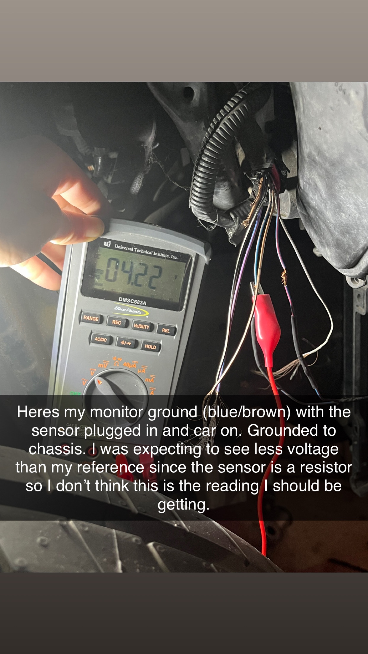 Adding onto my last statement I did also check to make sure my blue/red and blue/brown wires weren’t shorted together between the JBE connector and my sensor connector with multiple methods which I stated earlier in this thread so I’m still wondering why would my monitored ground wire be reading the same voltage as my reference voltage wire? Issue with JBE maybe? I did get a new dme and cas module but I had a shop clone my previous dme and cas to my car and I have no other issues with the car besides this one so I don’t think that has anything to do with it, but I could be wrong.