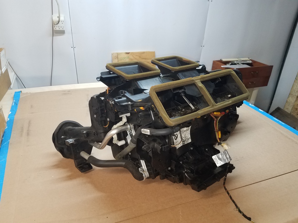 Every other part of the un-installation has been a project unto itself, quite a few times now I said to myself self, wtf did you get yourself into this time?? By then it was too late to turn back tho, in for a penny in for a pound and praying it all goes back together.Today the new HVAC cabinet arrived, it's just the box and flaps. I thought the gaskets would be on it but no, that's separate so have them on order with local dealer. Tomorrow I have to transfer over the blower box, the electric flap actuators (there's 8 of them) and install the new heater core and ac evaporator, wish me luck. |